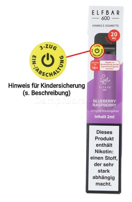 Um die Elf Bar mit Kindersicherung ein- oder auszuschalten, ziehen Sie innerhalb von zwei Sekunden 3-mal schnell hintereinander am Mundstück.