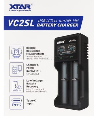 Das Ladegerät VC2SL verfügt über einen farbigen VA-LCD Bildschirm. Dieses zeigt den Echtzeit-Ladestrom, die Ladekapazität, den Akkutyp, die Akkuspannung und den Innenwiderstand an. Daneben verfügt das XTAR VC2SL zu Ihrer Sicherheit über einen Überhitzungs-, Überladungs- und Kurzschlussschutz sowie einem flammhemmenden Gehäuse.